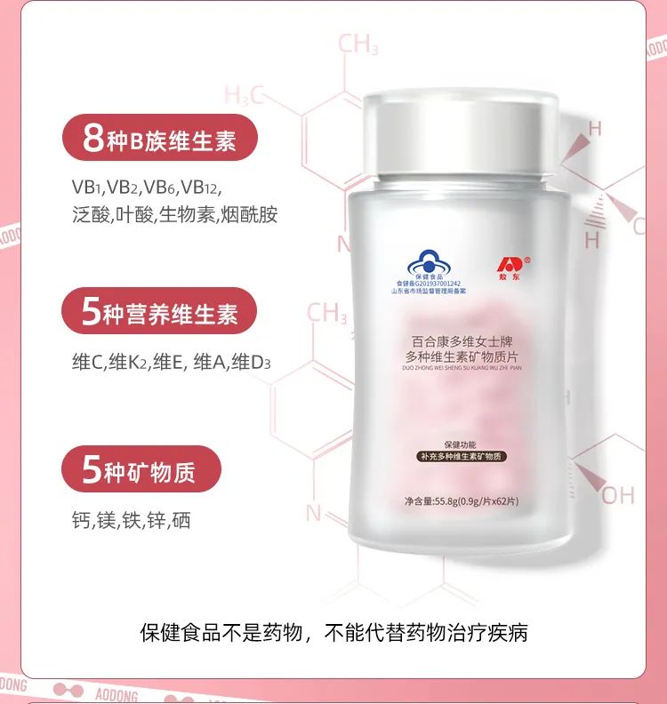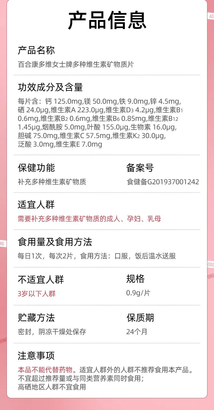 这款卖爆了的多种维生素产品,是百合股份与吉林敖东健康科技有限公司合作推出的一款网红单品——百合康多维女士牌多种维生素矿物质片。是专门针对女性人群设计的一款维生素矿物质膳食补充剂。