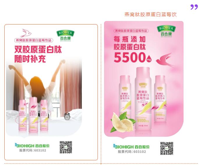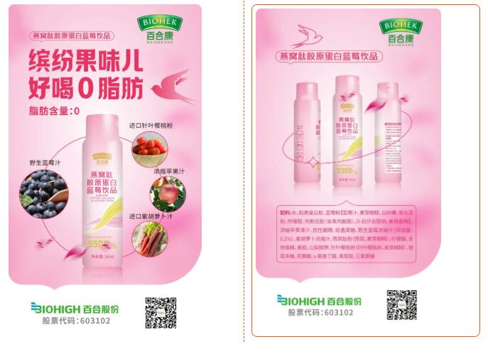 百合股份带来了自己研发的一系列新品,包括燕窝肽胶原蛋白蓝莓饮品,以及芦荟酵素西梅饮。