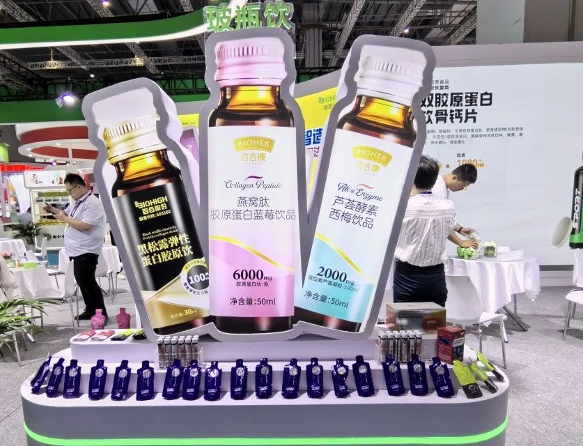 以目前市场体量巨大的胶原蛋白产品为例,百合股份配方库中拥有200+相应配方,本次展会现场也带来了燕窝肽鱼胶原蛋白肽、黑松露弹性蛋自胶原饮、中食月太牌维C海洋鱼皮胶原肽口服液(葡萄味)、鱼胶原三肽玫瑰纯露、双参胶原蛋白肽饮等等20精选品类,涵盖了健字号保健食品、运动营养、普通食品多个品类,玻瓶饮、塑瓶饮、袋饮、软糖、软胶囊等多个剂型。