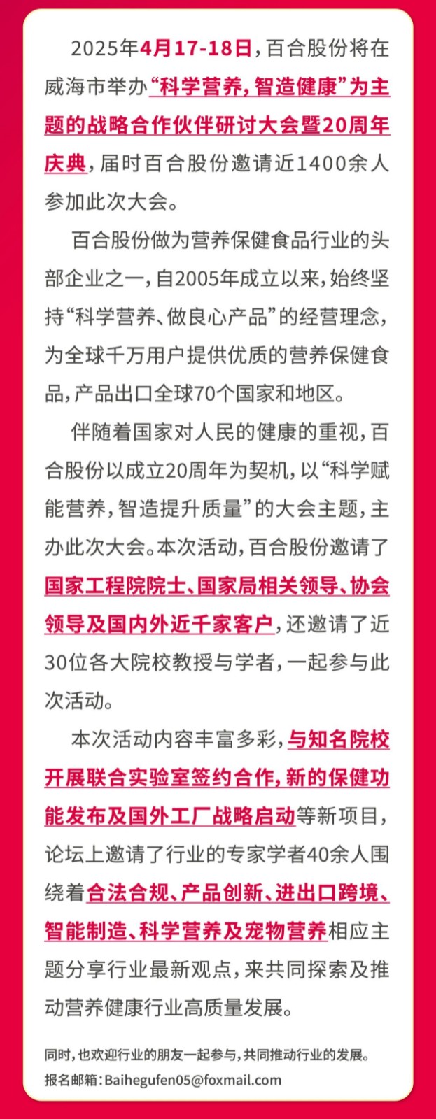 科学营养·智造健康——百合股份2025年战略合作伙伴研讨大会暨成立20周年庆典即将启幕