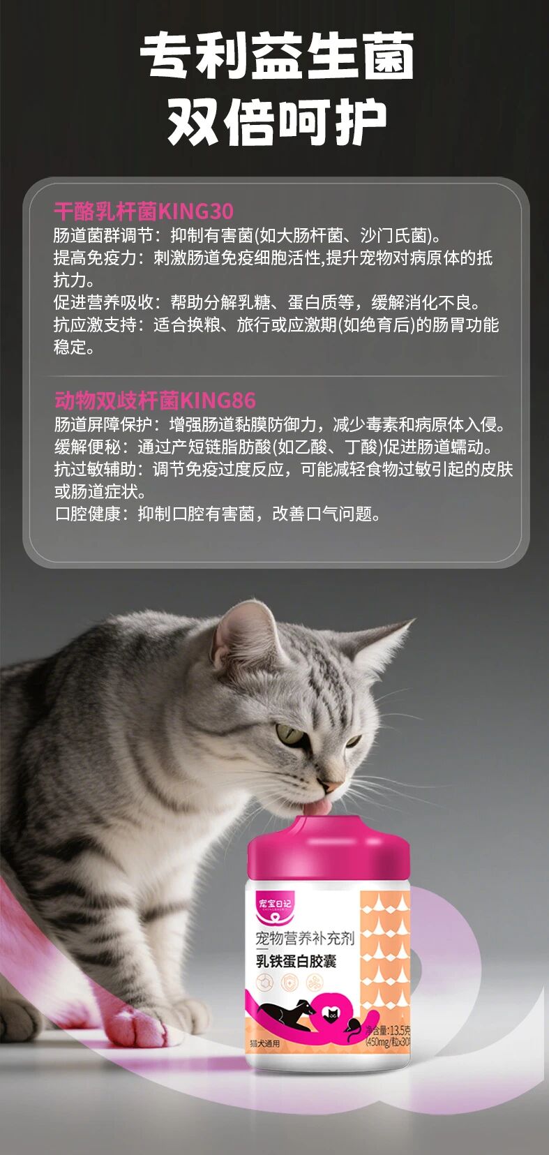 几乎所有家长,都听过这两个名字: 鱼油和乳铁蛋白。 为了毛孩子的健康,我们都愿意在自己的能力范围内给它最好的,下单时眼睛都不眨一下。 但,理想很丰满,现实却总是“翻车”…… 喂了那么久鱼油,为什么毛发还是像枯草? 纯度是道坎: 低纯度鱼油混杂着多余脂肪,补充效率低,还可能增加身体负担。 活性难保全: 鱼油娇贵,怕光怕氧,开封那一刻起,新鲜度就在倒计时。你给毛孩子喂的,可能已经氧化无效。 适口性是难题: 腥味扑鼻,主子闻了直接埋屎,追着喂都喂不进去,爱和钱都被浪费了。 都知道乳铁蛋白能增强免疫 可这东西,比家里的猫主子还“高冷”—— 太娇气,易失活: 它不耐高温,市面上很多猫条、零食因制作工艺,经过高温后,珍贵的乳铁蛋白活性早已所剩无几。你买到的可能不是乳铁蛋白,而是“乳铁蛋白的尸体”。 配方也是坑:好不容易喂下去,结果开到了“盲盒”——可能因为配方不佳,导致肠胃不耐受,拉肚子……好心给毛孩子补充营养,反倒补出了新问题,头疼! 难道市面上就没有既有效、又稳定、还好吸收的解决方案吗? 别着急,这些喂养痛点,宠宝日记来帮忙—