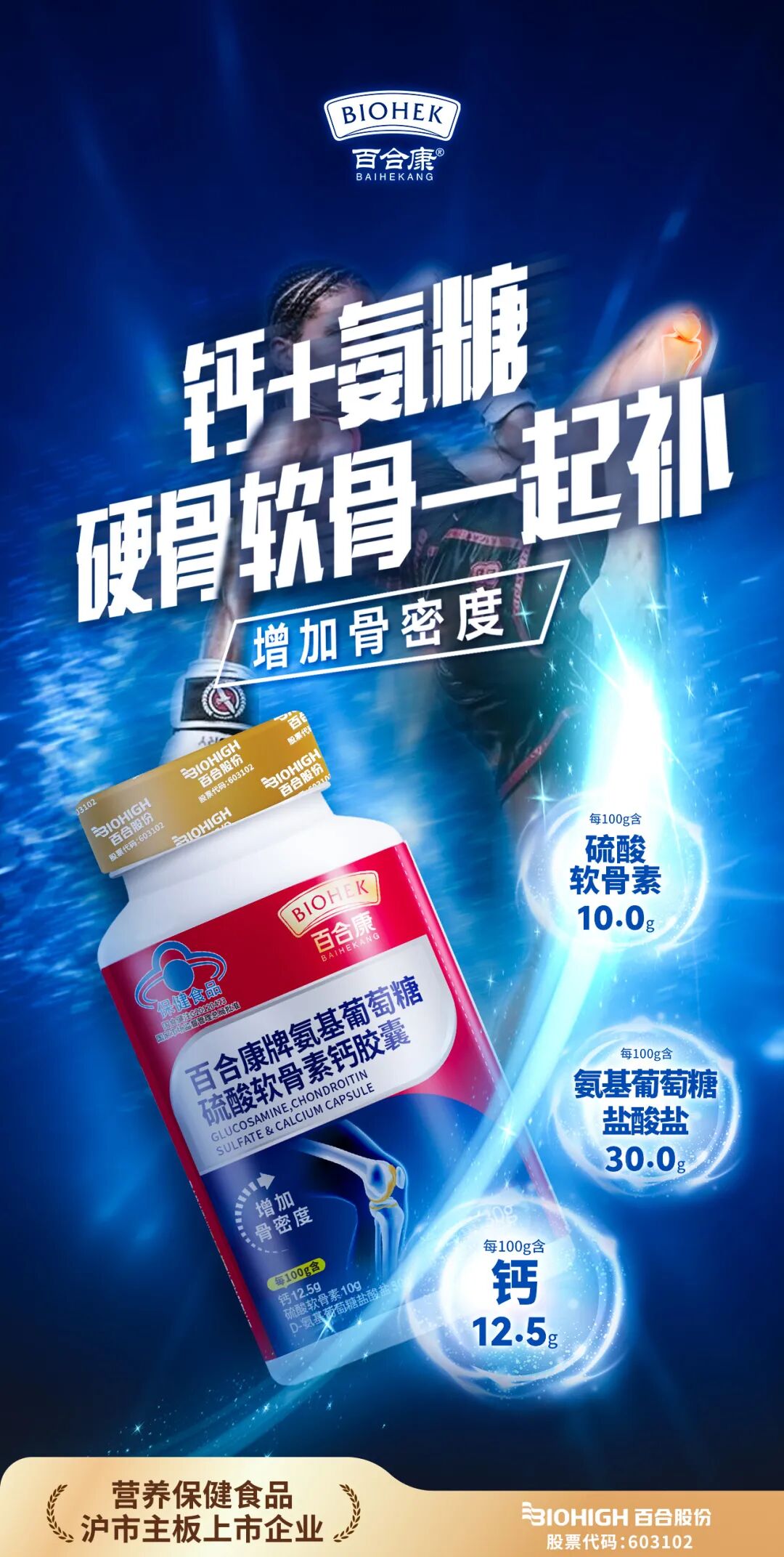 百合康牌氨基葡萄糖硫酸软骨素钙胶囊,以“牛骨提取硫酸软骨素”区别与行业同品类产品,彰显产品实力,精准贴合中老年人关节健康养护需求,采用科学配比助力;