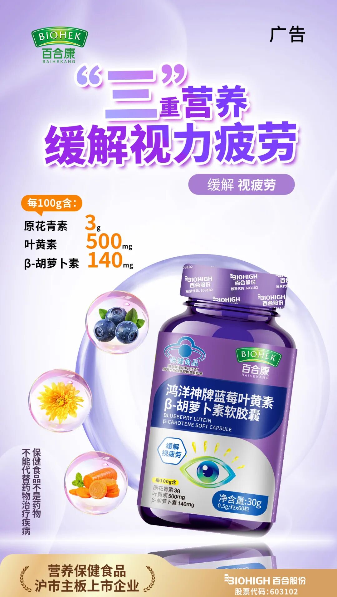 百合康牌蓝莓叶黄素β-胡萝卜素软胶囊则聚焦眼部健康,优质野生蓝莓萃取,每100g含原花青素3g、叶黄素500mg、β-胡萝卜素140mg,具备扎实的科学配方基础。覆盖从青少年到都市白领再到中老年等多类需求人群,缓解视觉疲劳。
